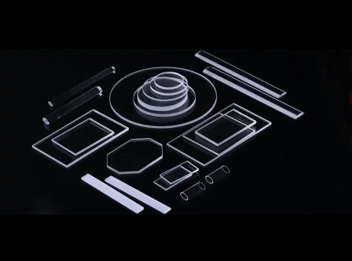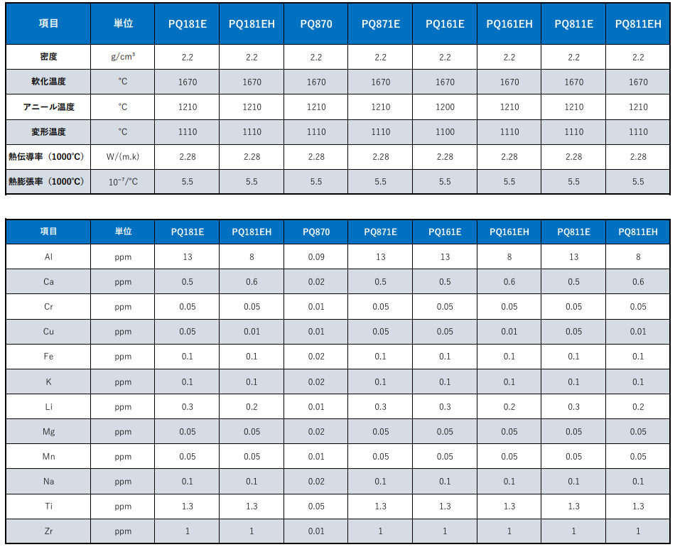 二酸化ケイ素(SiO2)からなる非晶質(ガラス)材料です。高純度、高い熱安定性、優れた光透過性、および低熱膨張率が特長です。不純物が極めて少ないため、半導体製造プロセスにおける拡散炉やエッチング装置の治具・窓材として、汚染を嫌う場面で広く採用されています。また、その光学的特性を活かし、光学レンズ、レーザー関連部品、紫外線ランプのカバーなどにも用いられ、先端技術に不可欠な基盤材料です。